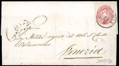 53 * 1860 - Lettera da Trieste, in Austria, per Marmande, in Francia, del 9/6/1860 affrancata con 15 kr. azzurro, tariffa sino al confine Austria-Svizzera. La lettera transitò per Feldkirch, St. Gallen, Zurigo, Basilea, Parigi e quindi giunse a Marmande il 15 giugno, bolli di transito e arrivo al verso, segni di tasse cancellati e dicitura “Ne transit pas”. Rara e interessante via di Svizzera.