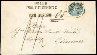 37 * 1864 - 10 soldi azzurro, dent. 9 1/2 (44), perfetto, su frontespizio di busta con parte del verso da Padova 12/9/1864 a Chiaravalle nelle Marche, parziale bollo di arrivo al verso; sul fronte lineare “bollo insufficiente”, “Deb.Aus.S.di” 5 e tassazione 15 cent. Non comune.