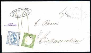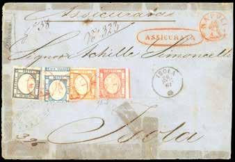 28 * 1865 - 2 soldi giallo, dent. 14, tre esemplari, uno leggermente difettoso, 10 soldi azzurro, dent. 9 1/2 (36,44), perfetti, su lettera da Chioggia 30/10/1865 a Firenze, bollo “PD” in rosso coannullatore. Pregevole affrancatura mista di due emissioni differenti. Raybaudi, cert. Avi.