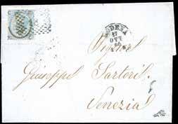 54 * 1866 - Lettera, parzialmente incompleta al verso, da Palma per Udine del 1/10/1866 affrancata con 10 cent. De La Rue (Regno L17), al verso bollo di arrivo del 2/10. L’uso di francobolli italiani nelle località ancora occupate dagli austriaci è estremamente raro, ancora di più per il calcolo della tariffa austriaca assolta con un francobollo da 10 centesimi equivalente al porto di cinque soldi. Eccezionale uso di un francobollo d’Italia a Palma prima della fine dell’occupazione austriaca. Grande rarità del settore. Cert. Colla