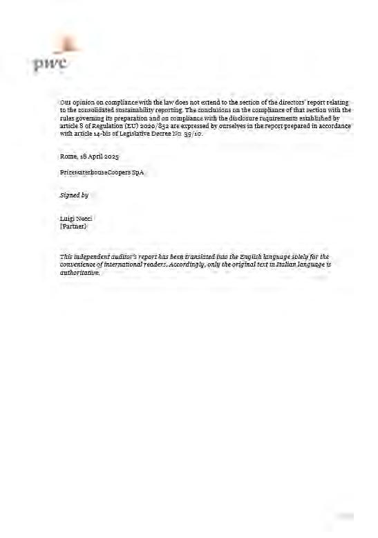 are consistent with the facts and information known to us. In this regard, as stated in the independent auditors’ report, it emerges that the financial statements for the financial year ended 31 December 2024 have been prepared in accordance with the IFRS issued by the International Accounting Standards Board, and adopted by the European Union in compliance with the Italian regulations governing their preparation. Furthermore, the Independent Auditors have certified that they performed their audit work in accordance with International Standards on Auditing (ISA Italia) prepared pursuant to Article 11 of Decree no. 39/2010.