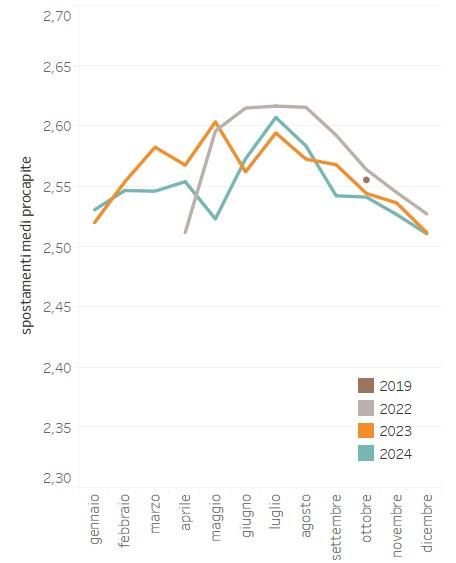 Da un confronto con il trimestre precedente (terzo trimestre 2024) emerge una riduzione degli spostamenti medi giornalieri di circa il 4,0% rispetto a settembre 2024, a fronte di una riduzione quasi analoga (-4,1%) delle percorrenze medie per spostamento, che comporta una riduzione complessiva degli spostamenti*km/giorno del 7,9%.