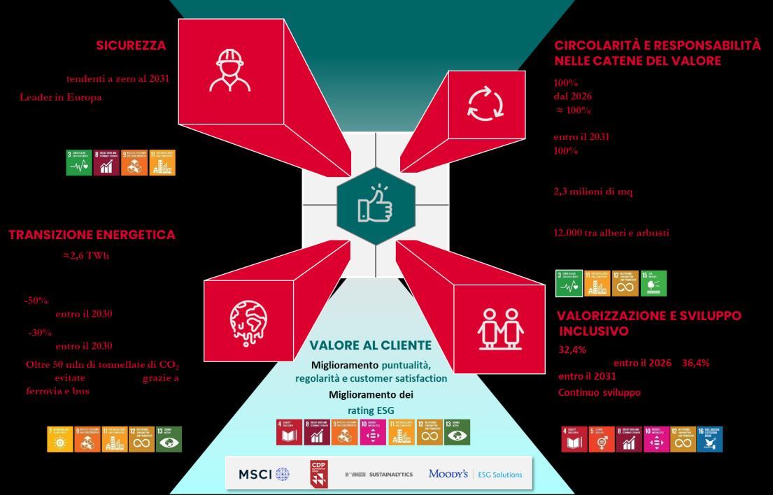 il settore privato ad abbattere le emissioni climalteranti per contenere il riscaldamento globale entro 1,5 °C. Nell’estate del 2022 FS Italiane ha firmato la lettera di impegno per certificare i propri obiettivi: prendendo come base di riferimento il 2019, dimezzare le emissioni dirette e indirette (scope 1 e scope 2) entro il 2030 e ridurre del 30% quelle legate alla catena del valore (scope 3), per raggiungere la neutralità carbonica al 2040 con zero emissioni nette. Oltre ad abbassare progressivamente le emissioni, il Gruppo favorisce lo shift modale affinché sempre più persone utilizzino il treno e i mezzi pubblici e le imprese scelgano la ferrovia per far viaggiare le merci. La logistica, infatti, è un altro settore prioritario d’intervento: il Gruppo punta a elevare la quota di merci trasportate su ferro al 30% entro il 2030, come chiesto dall’Europa.