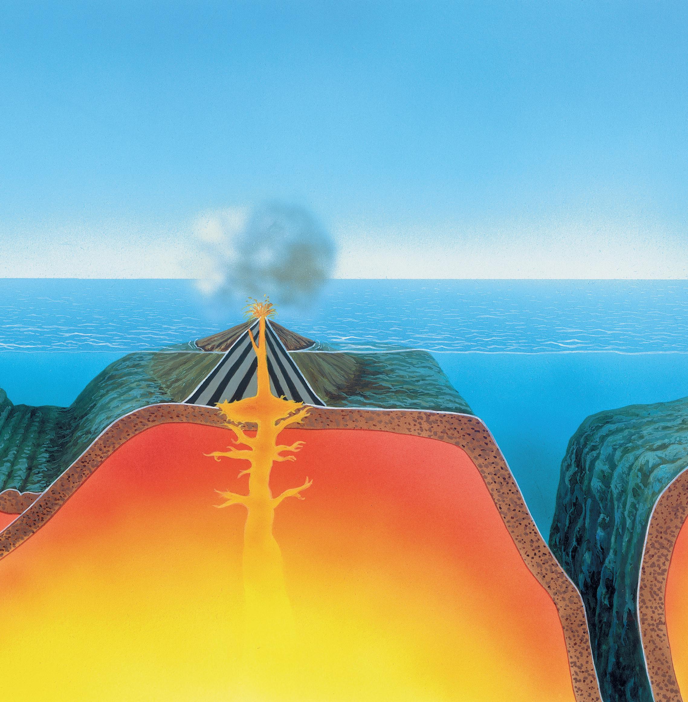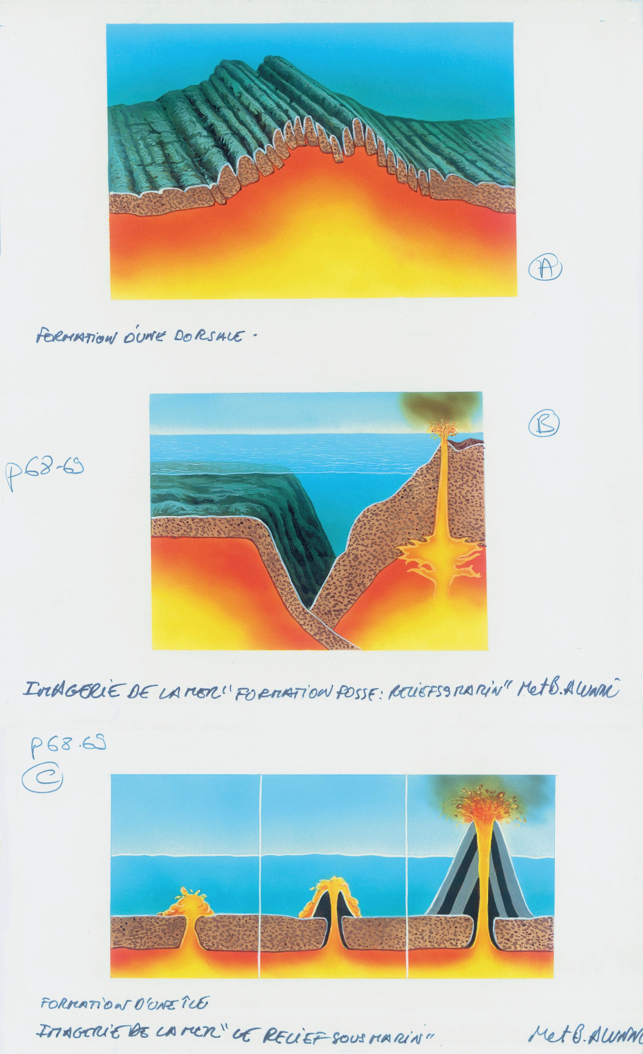 Au contact de l’eau, il durcit et forme un volcan sous-marin B . Quelquefois, le volcan grandit tellement qu’il dépasse de la surface de l’eau et crée une île C