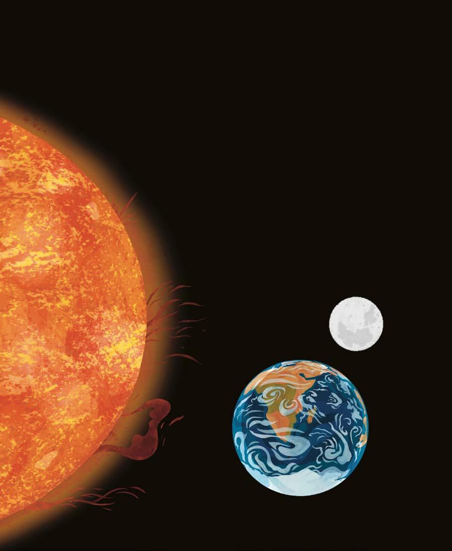 Ni trop loin, ni trop près de la Terre, le Soleil l’éclaire et la réchauffe. Il te semble tout petit dans le ciel mais il est beaucoup plus gros qu’elle ! La Lune, elle, ne brille pas. On la voit – surtout la nuit – car elle est éclairée par la lumière du Soleil.