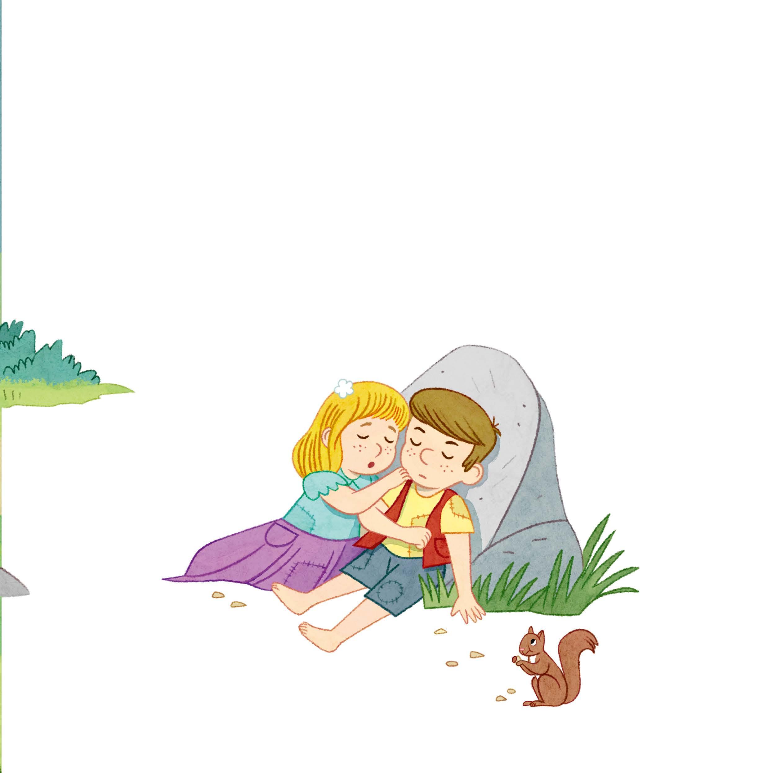 Puis ils s’endormirent pendant que leurs parents coupaient du bois. Au réveil, les enfants étaient tout seuls !