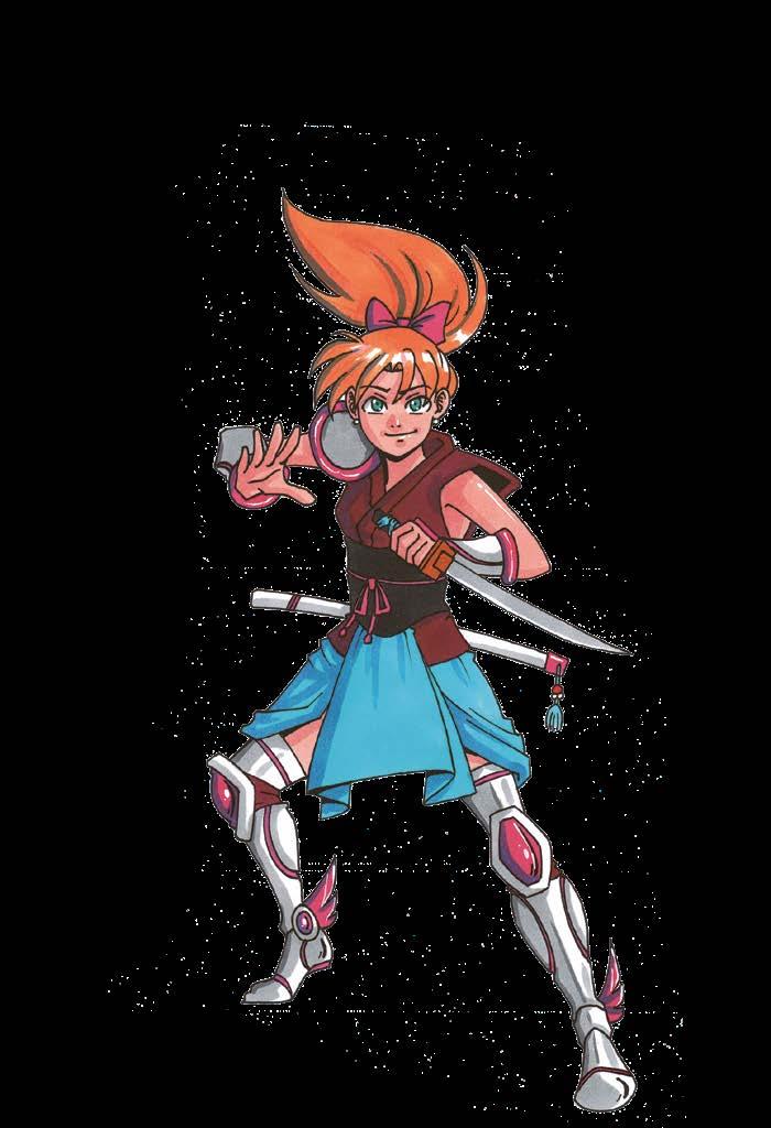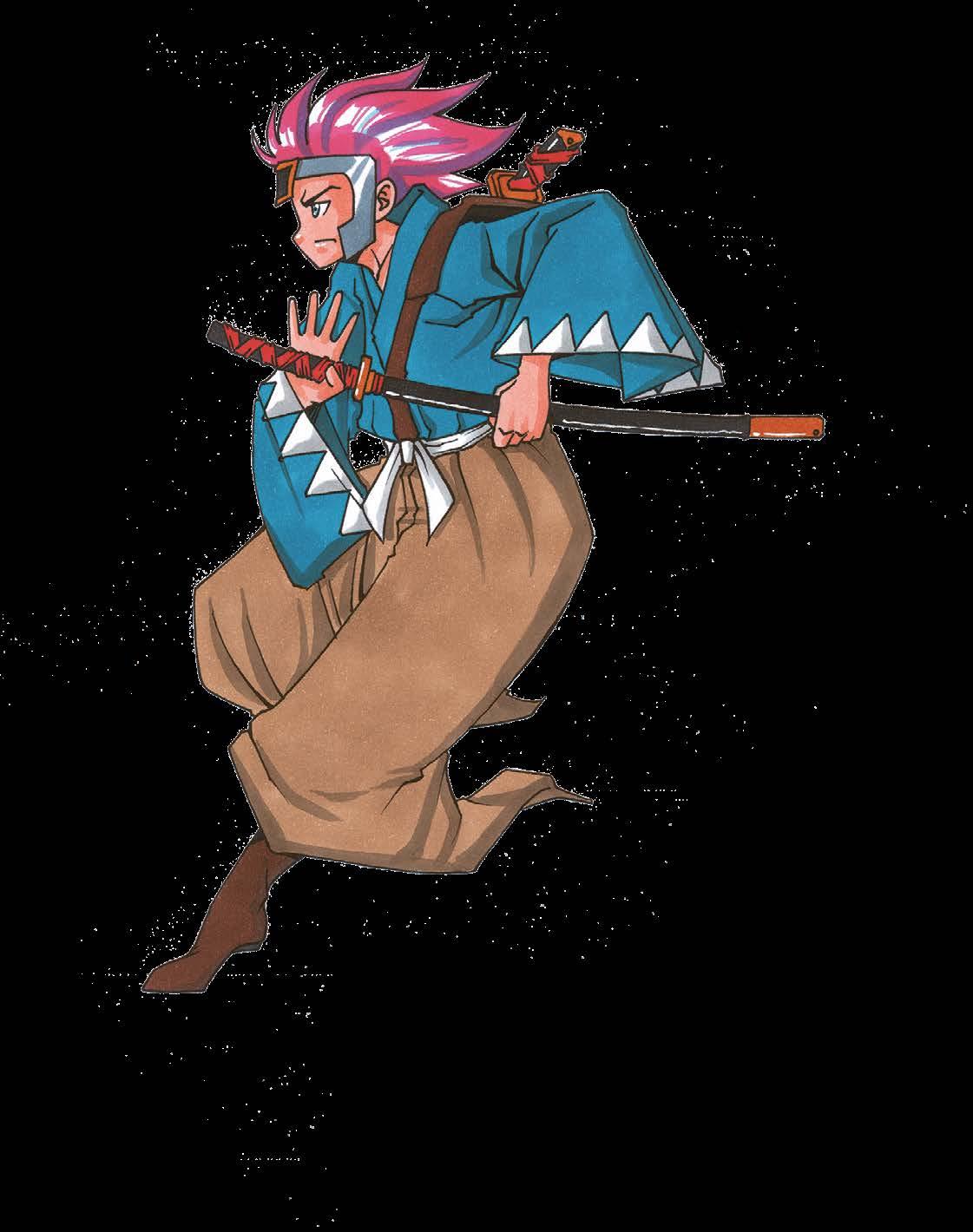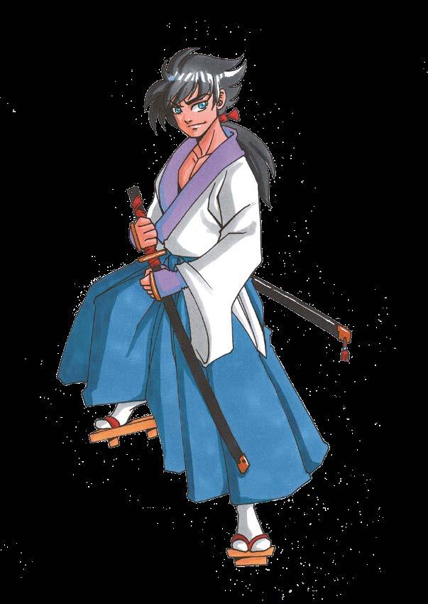 Élabore sa chevelure et détaille l’intérieur de son oreille. Ajoute un katana dans son dos. Accentue les pans de son pantalon et son talon.