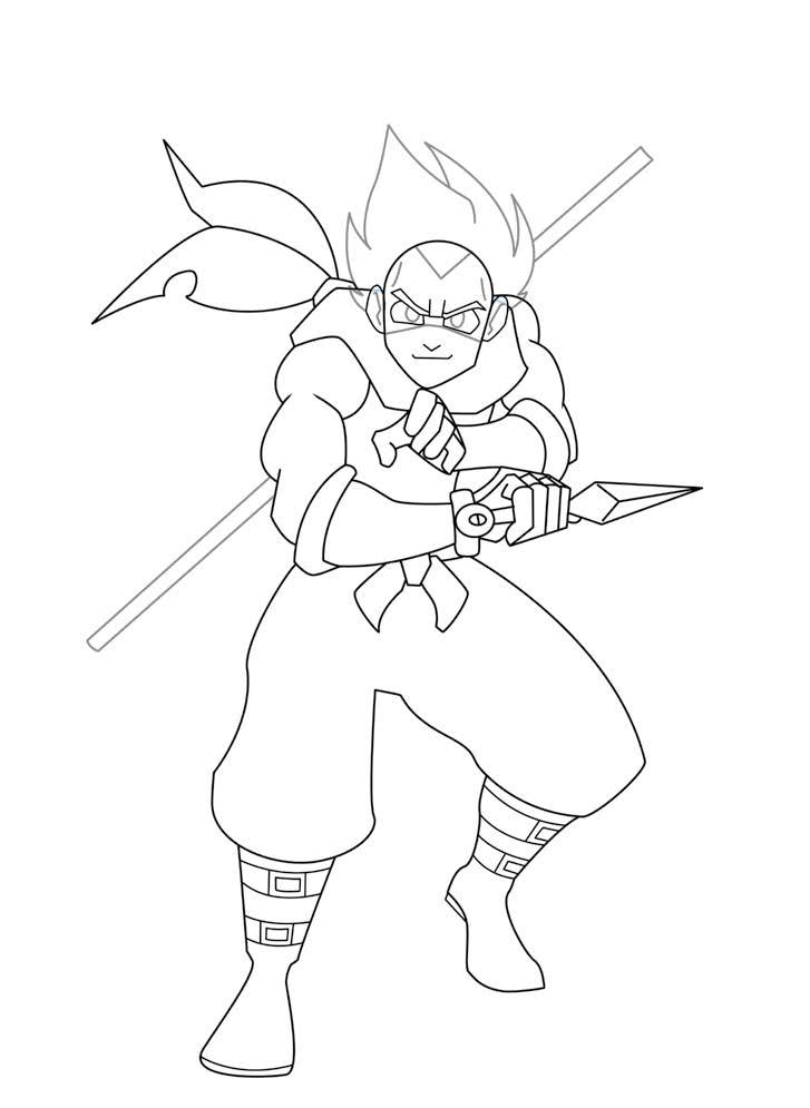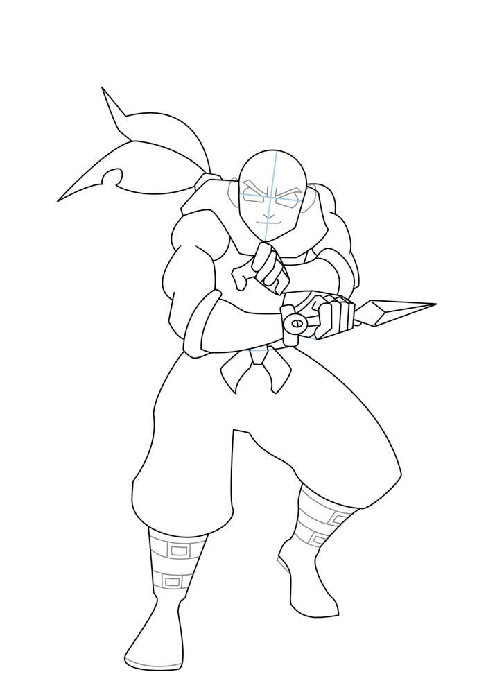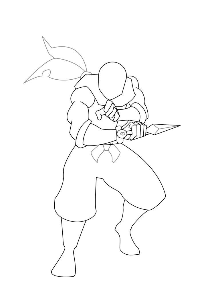 Ajoute les détails sur le kunaï. Dessine les nœuds du foulard et de la ceinture.
