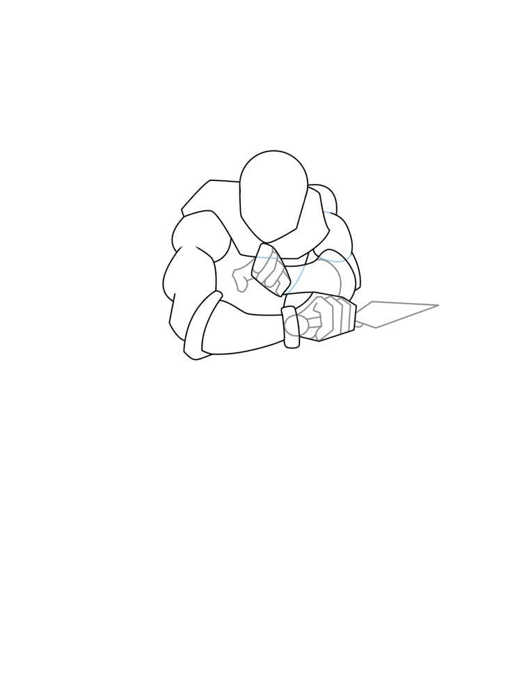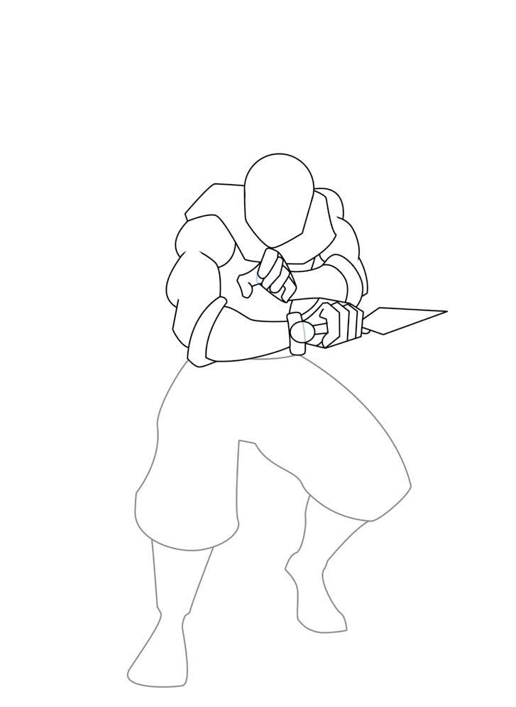 Termine en accentuant ses muscles et les plis de sa tenue. Trace les détails de sa lance et dessine la lame.