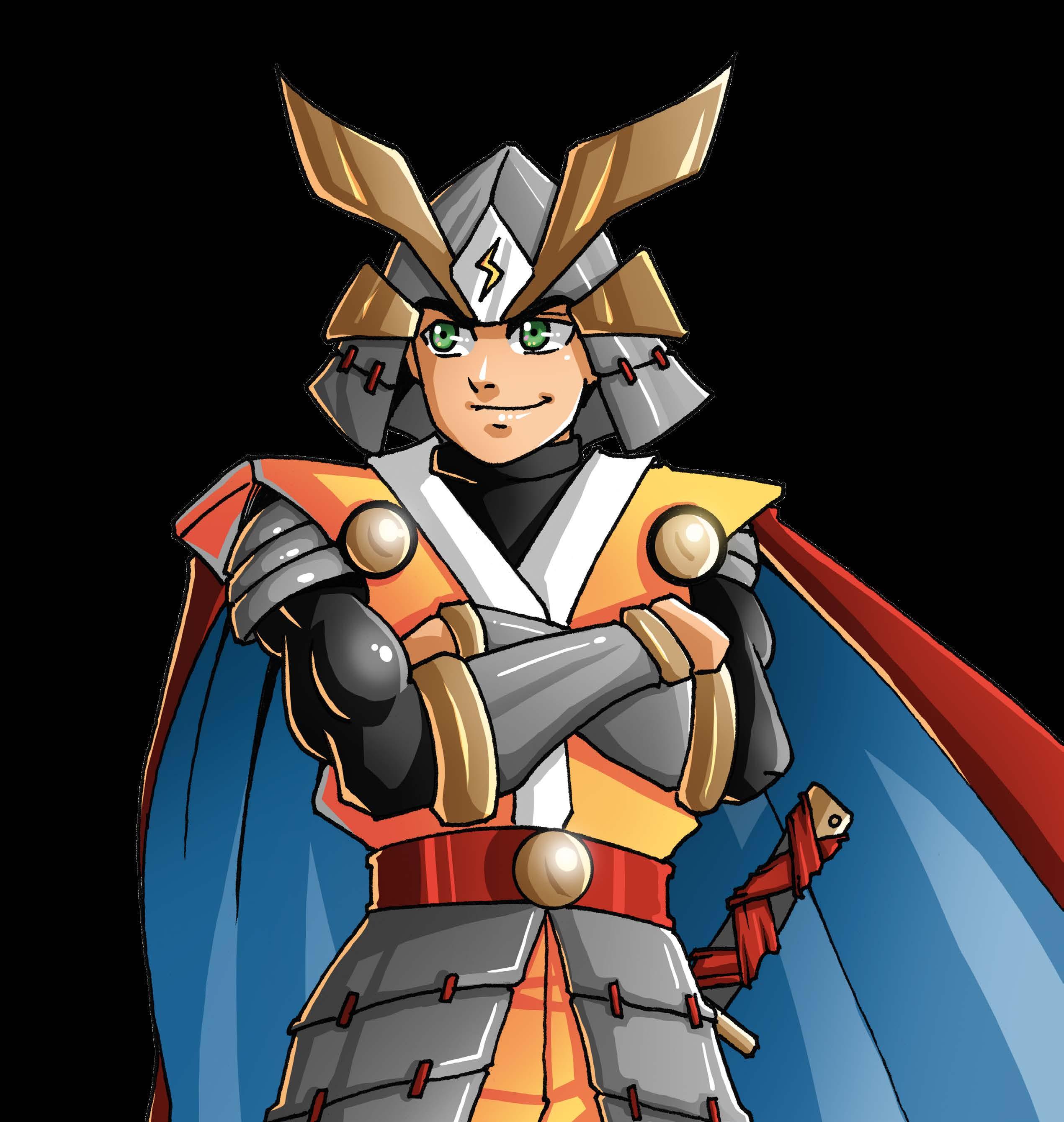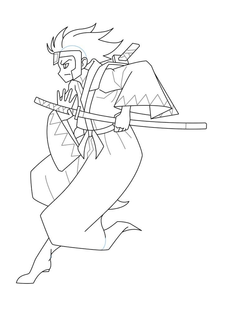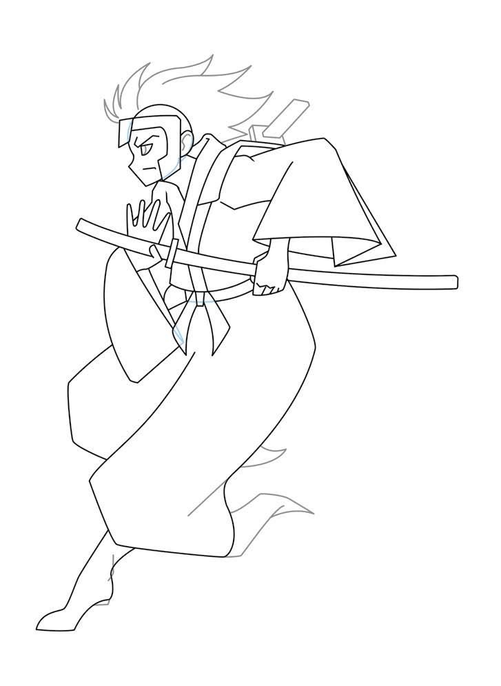 Détaille les plis du kimono et réalise le tressage des poignées des katanas. Ajoute l’ornement de son casque. Termine par des zigzags au bord des manches.