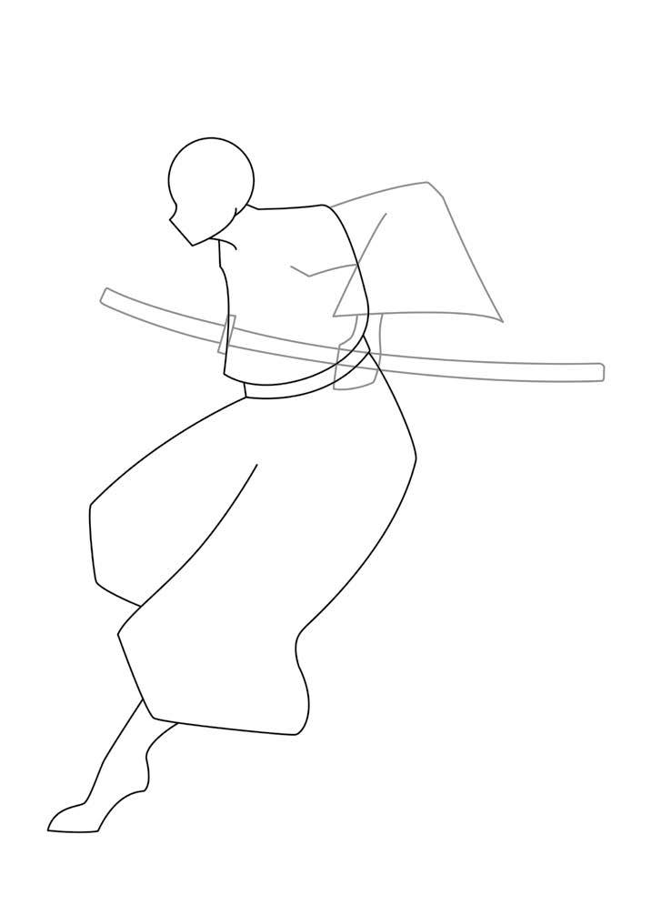 Esquisse le bras gauche plié vers l’arrière, avec sa manche de forme triangulaire. Il tient dans sa main un katana, un sabre japonais.