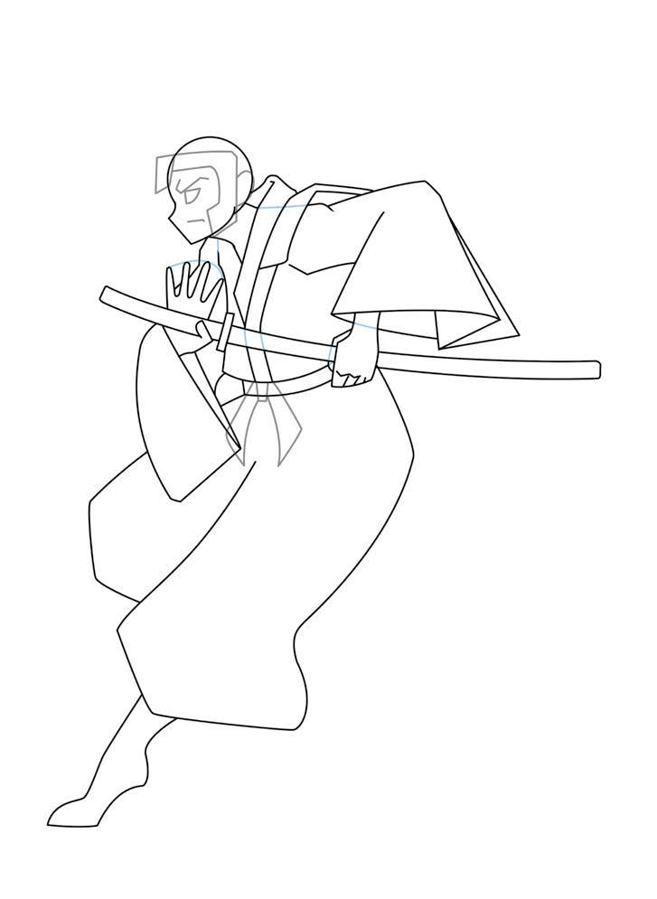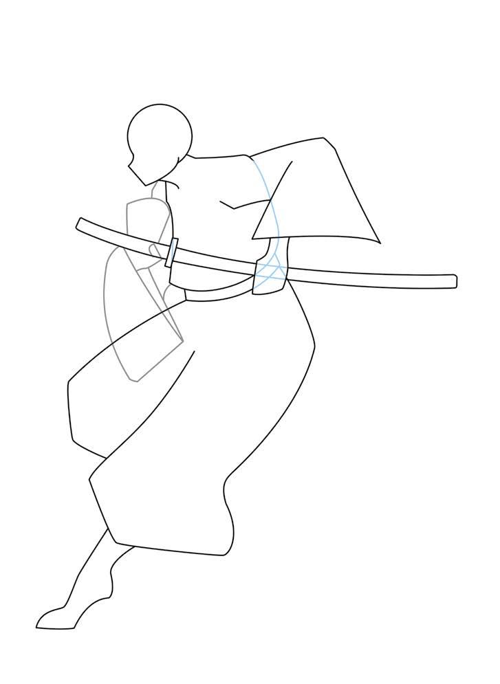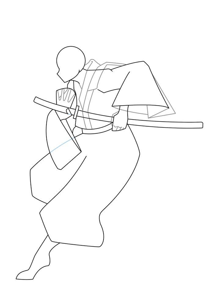 Dessine la main droite du personnage. Elle doit attraper le manche du sabre. Esquisse la manche tombante de son kimono.
