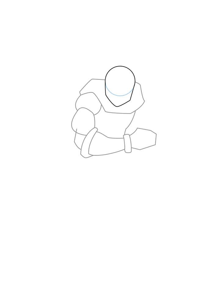Esquisse les traits de son visage concentré. Ajoute un casque, son oreille et le nœud de sa ceinture.