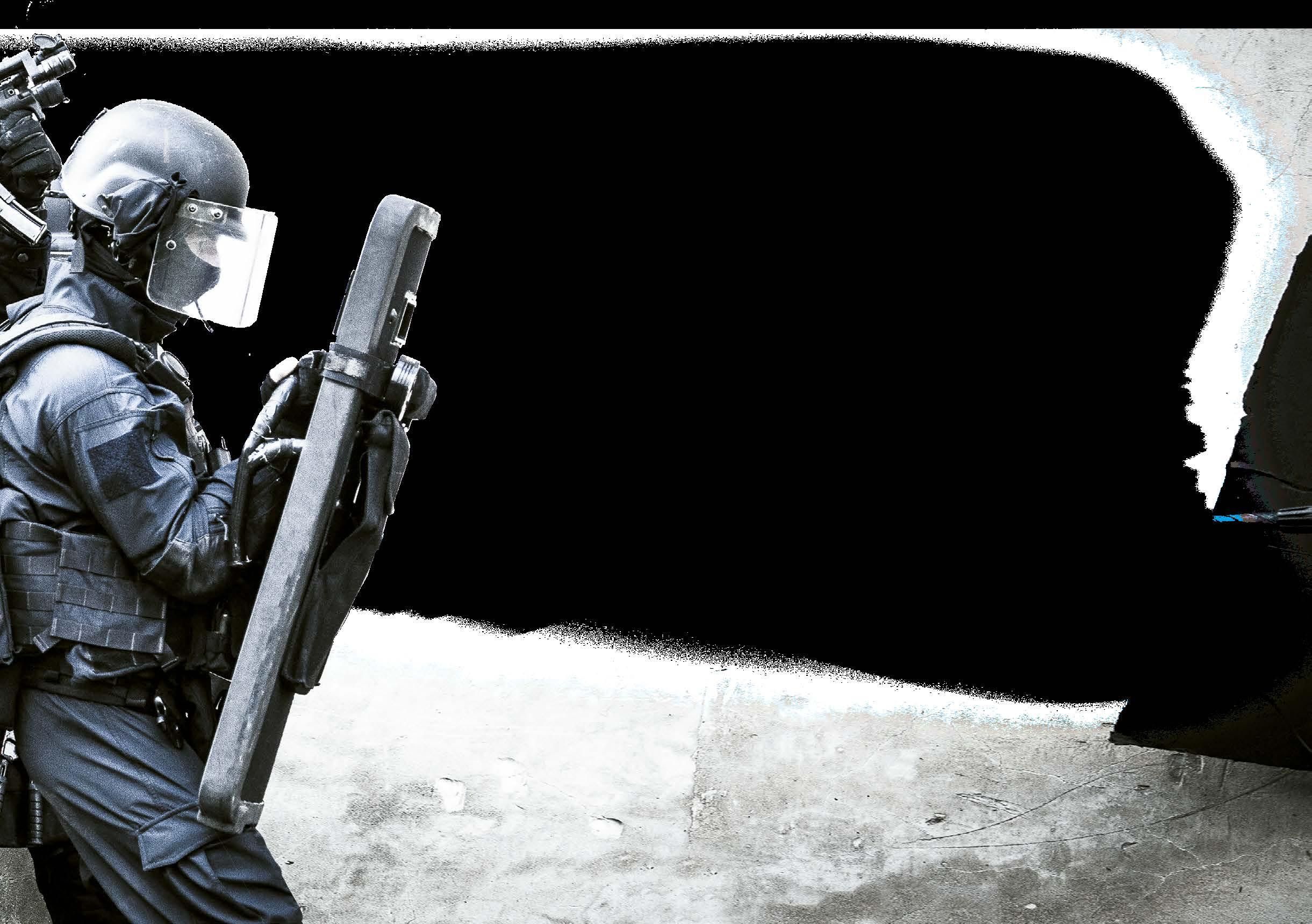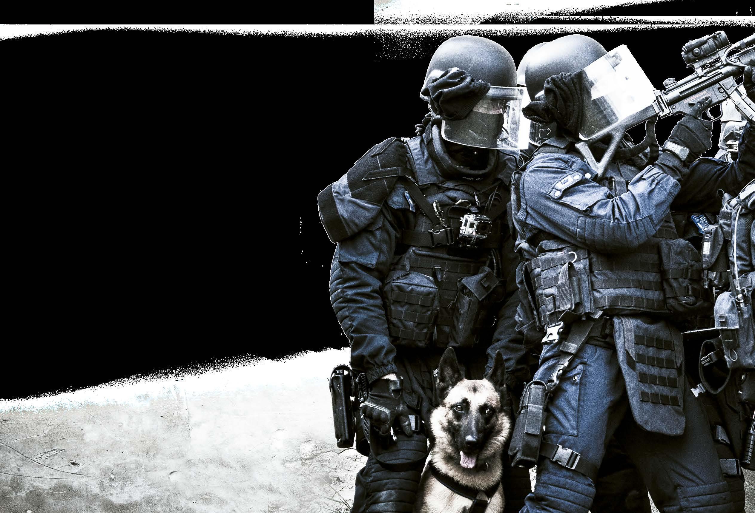 Ces membres du GIGN et un chien d’assaut s’apprêtent à investir un bâtiment. L’homme en première position porte un bouclier qui résiste aux impacts de balles. La tenue comporte un casque et un gilet pare-balles.La force n’est employée qu’en dernier recours, lorsque toutes les tentatives de négociation avec les malfaiteurs ont échoué.