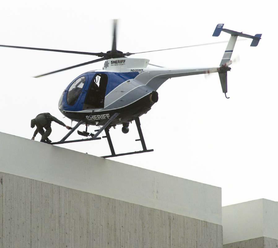 Le SWAT est l’unité spéciale des forces de police aux États-Unis. Prises d’otages, actions terroristes, arrestations dangereuses, lutte contre les gangs organisés : ils gèrent les situations les plus délicates et les plus dangereuses. Ci-dessus, un hélicoptère du SWAT se pose sur le toit d’un immeuble occupé par un homme armé.