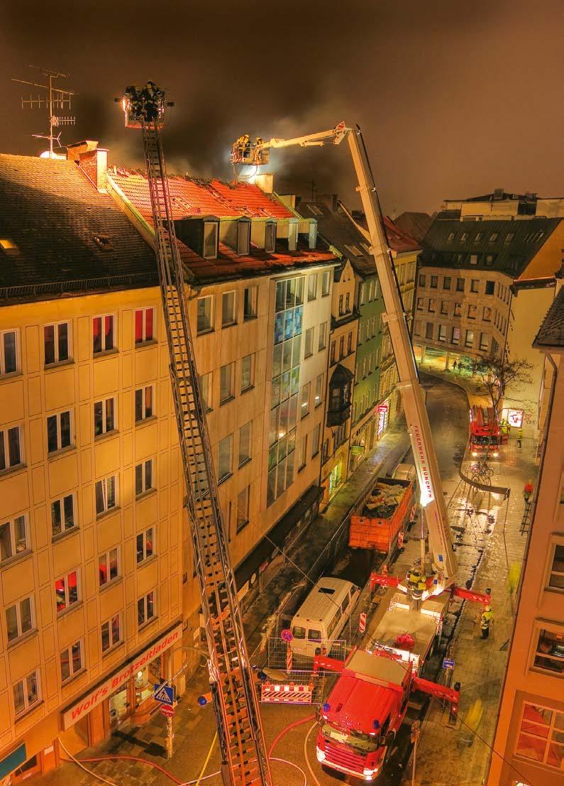 La grande échelle est déployée pour atteindre les étages supérieurs d’un bâtiment. Un pompier ne doit pas avoir le vertige, car elle mesure 30 m de haut !