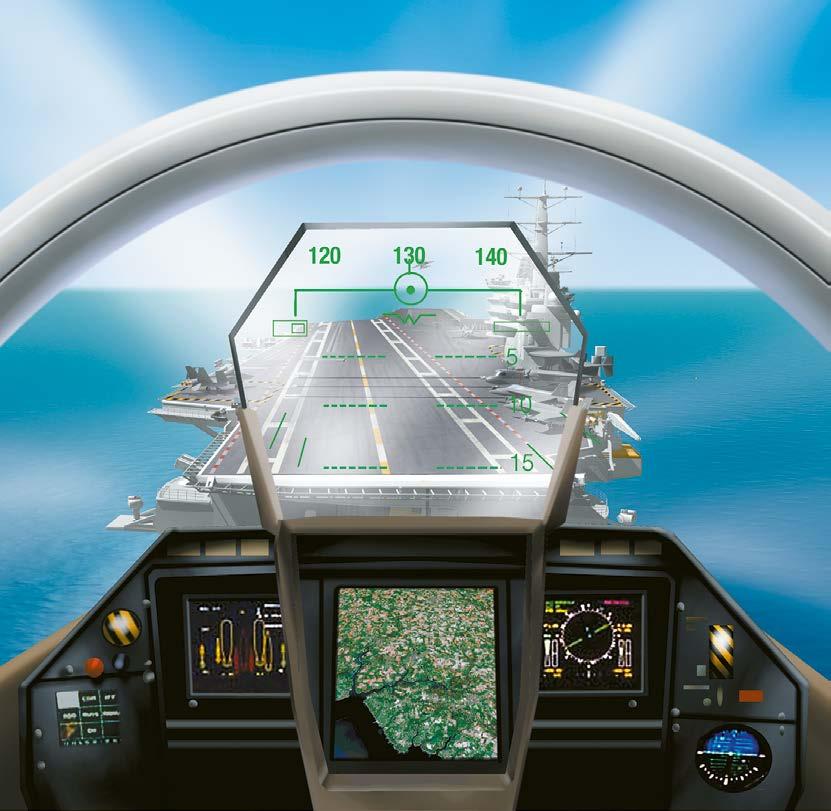 Sur la vitre du cockpit, le « viseur» permet de lire instantanément les indications de vitesse, de cap, d’altitude, sans perdre la piste de vue.