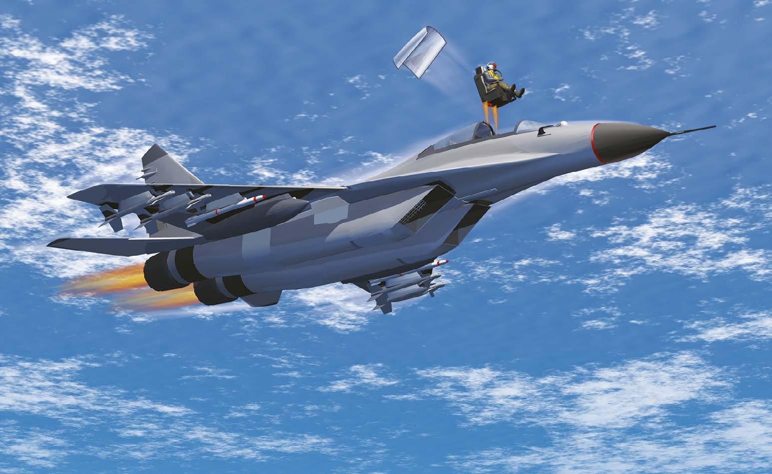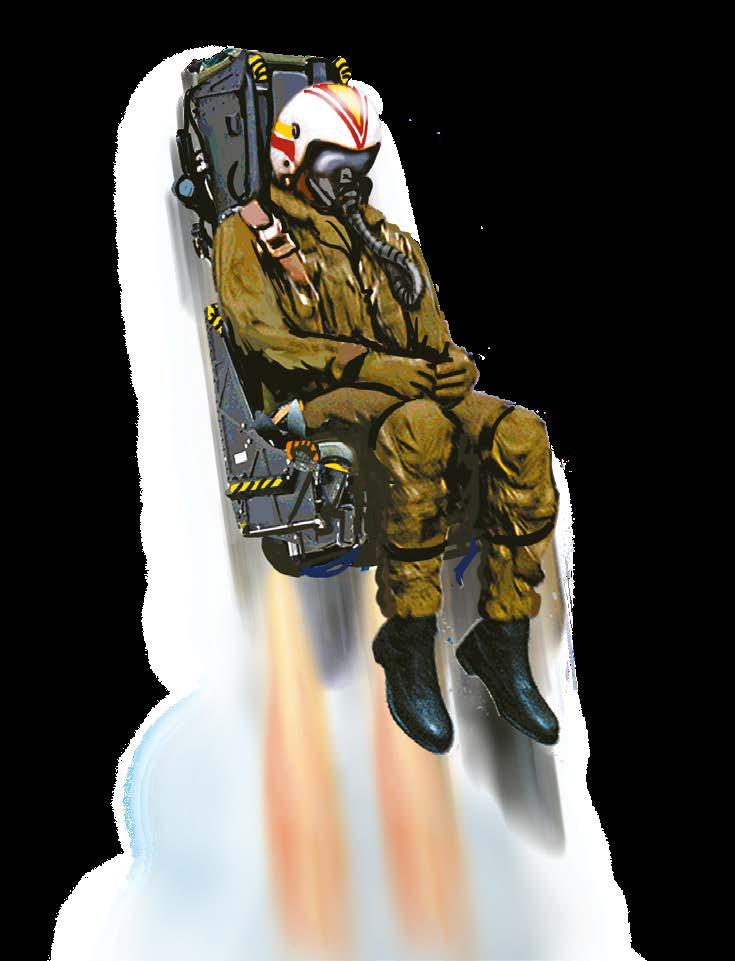 Lors d’un combat, un avion peut être touché et même s’enflammer. Le pilote doit être extrêmement réactif et ne doit pas hésiter à tirer sur la poignée d’éjection située entre ses jambes ou au-dessus de son casque. Aussitôt, la verrière du cockpit est larguée, ou fragilisée, de manière à permettre l’éjection du siège. En 1 à 2 secondes, le siège se détache et un parachute s’ouvre.