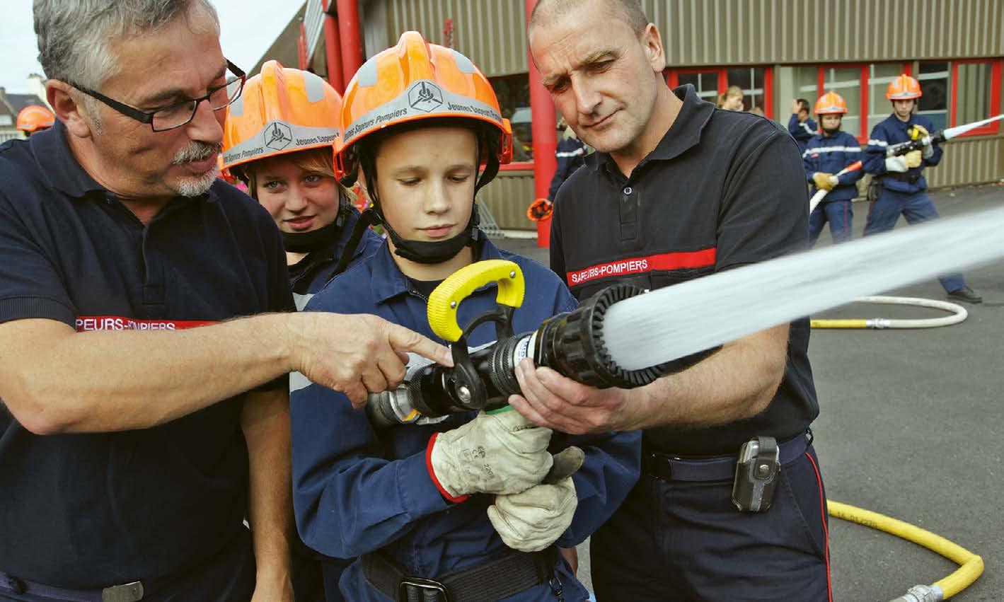 Dès l’âge de 10 ans, un enfant, garçon ou fille, peut s’initier au métier de pompier. Encadré par des pompiers professionnels ou volontaires, il porte un uniforme un peu différent de celui des grands, fait du sport, apprend à connaître et pratiquer les gestes qui sauvent. Il découvre aussi les techniques de lutte contre l’incendie et s’entraîne à utiliser le matériel (ci-contre, une lance à incendie).