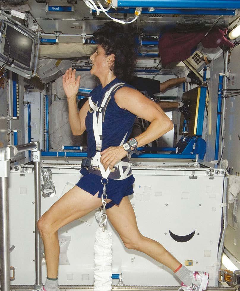 Dans l’ISS, les astronautes flottent et leurs muscles ne travaillent pas. Pour éviter que ceux-ci ne s’atrophient (qu’ils ne fondent), les astronautes font du sport tous les jours pendant environ 2 heures (vélo, rameur, course sur un tapis roulant, etc.).
