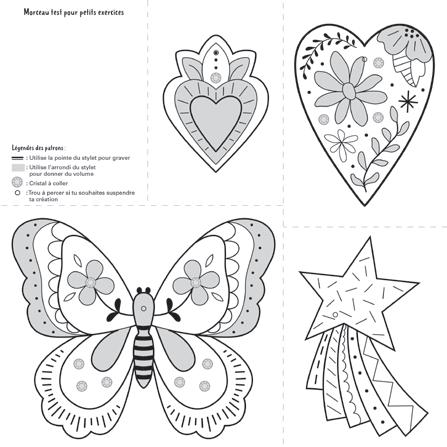 5 Quand tu es satisfait·e du résultat, découpe ta création autour du tracé extérieur. Entraîne-toi à découper sur le rectangle qui a servi pour les essais. Tu peux ensuite coller des cristaux en t’inspirant des modèles.