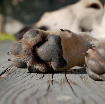 5 sur les pattes avant et 4 sur les pattes arrière. Chaque doigt est protégé par un coussinet (un petit tapis moelleux qui absorbe les chocs) et se termine par une griffe. Le 5ème doigt de la patte avant, que l’on appelle « ergot », est un peu spécial : il est tout petit et ne repose jamais sur le sol.