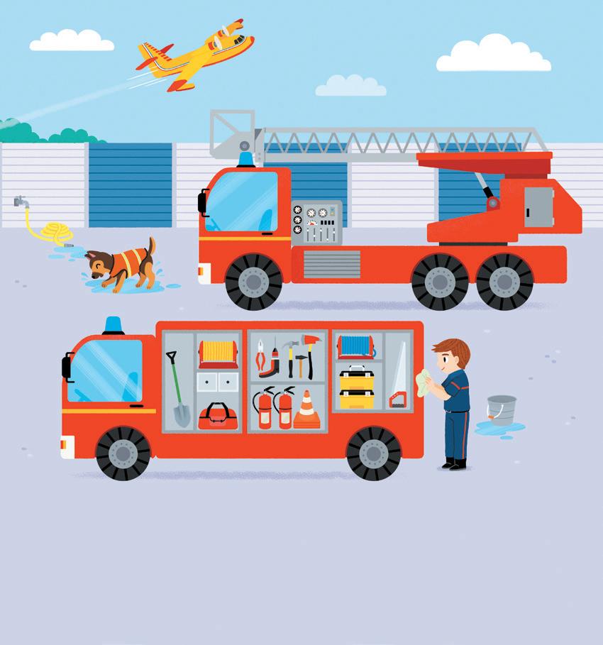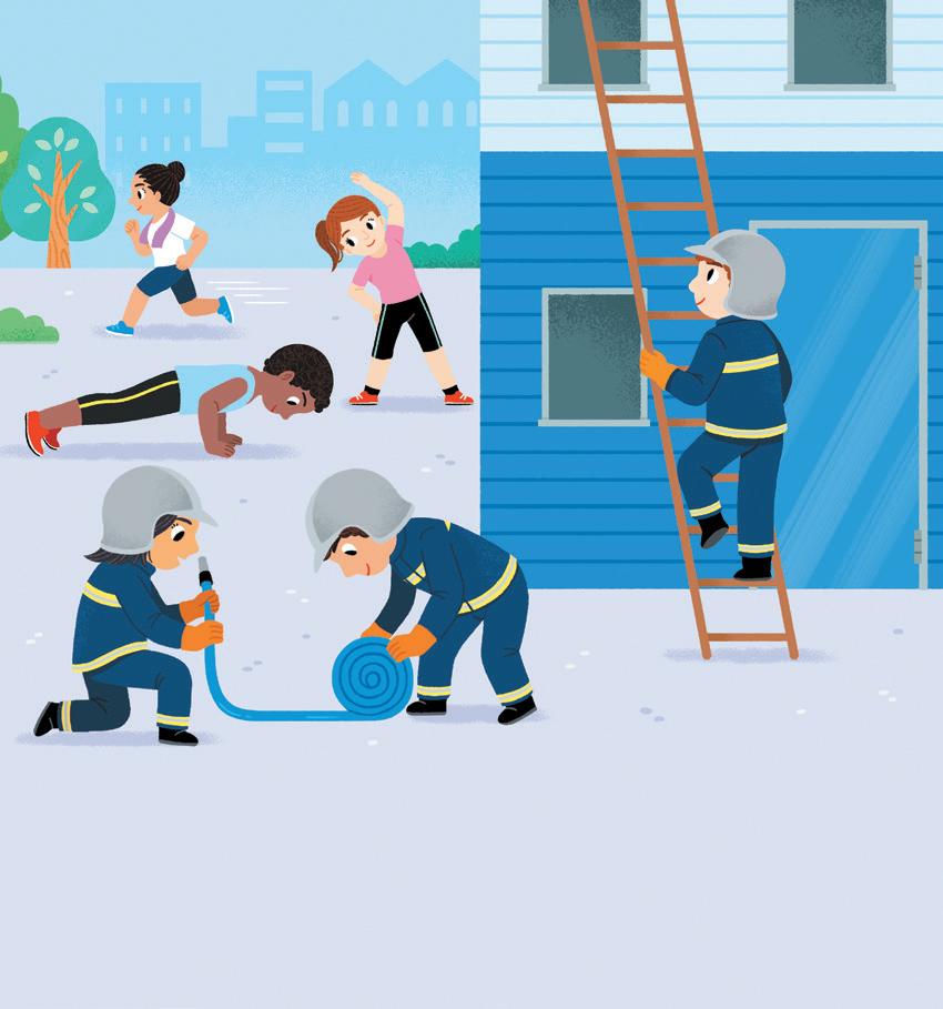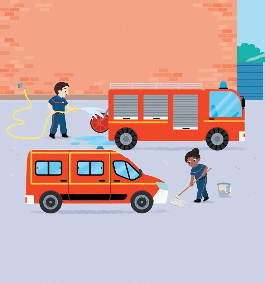 Ce mot désigne l’entraînement des pompiers. Comme toi à l’école, ils révisent chaque jour leurs connaissances : comment manier la grande échelle, dérouler les tuyaux, répéter les gestes qui sauvent, etc.