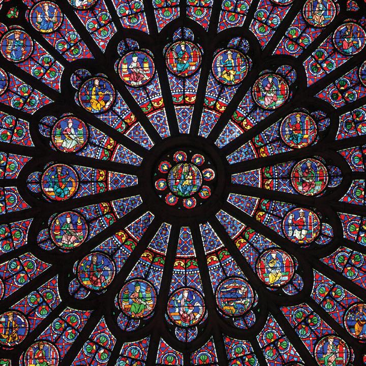 des vitraux disposés en cercle, dont celle-ci placée au nord.