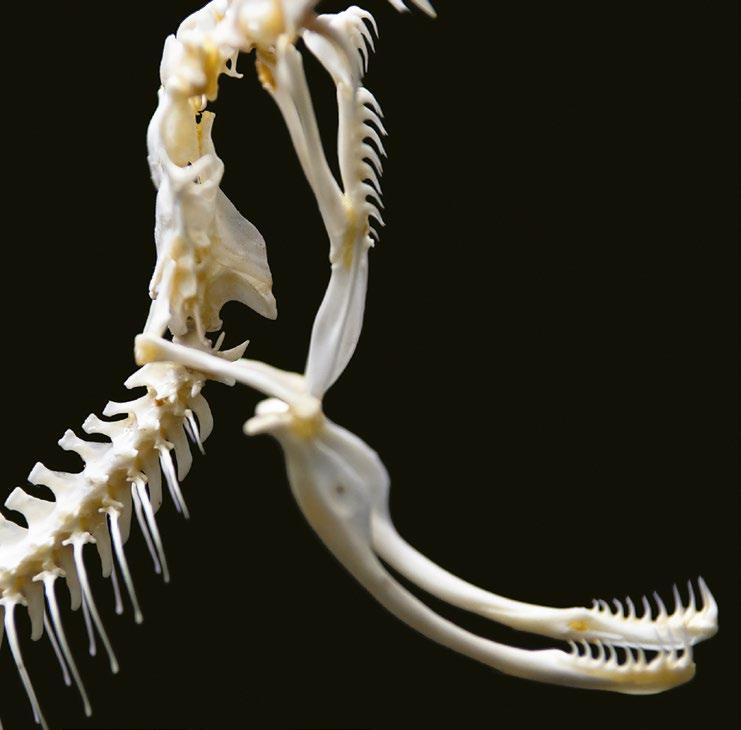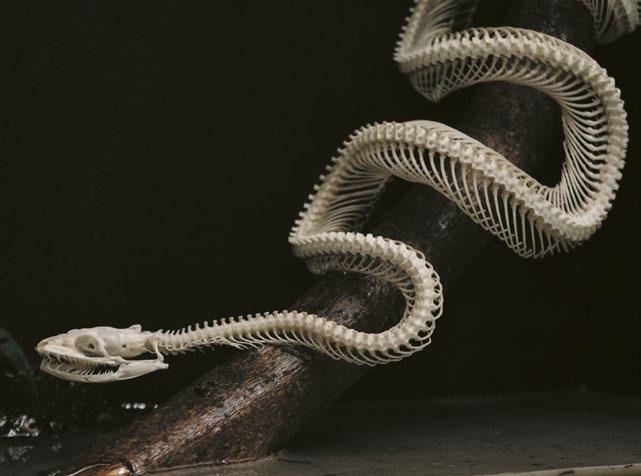 Les serpents ont une colonne vertébrale articulée mise en mouvement par des muscles puissants qui leur permettent de se déplacer en rampant. Le nombre de vertèbres varie de 150 à 400 selon l’espèce ! Elles permettent au serpent d’onduler avec souplesse. Chaque vertèbre est reliée à une paire de côtes mobiles capables de s’écarter pour laisser passer les proies, parfois très grosses, que le reptile avale toujours en entier.