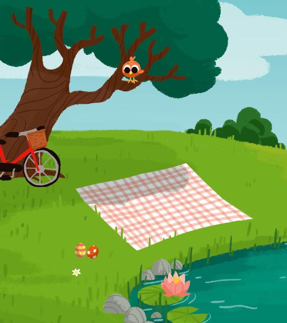 Regarde comme le soleil brille ! À pied, à vélo ou à trottinette… il fait un temps idéal pour partir en promenade ! Amuse-toi à compléter le paysage !
