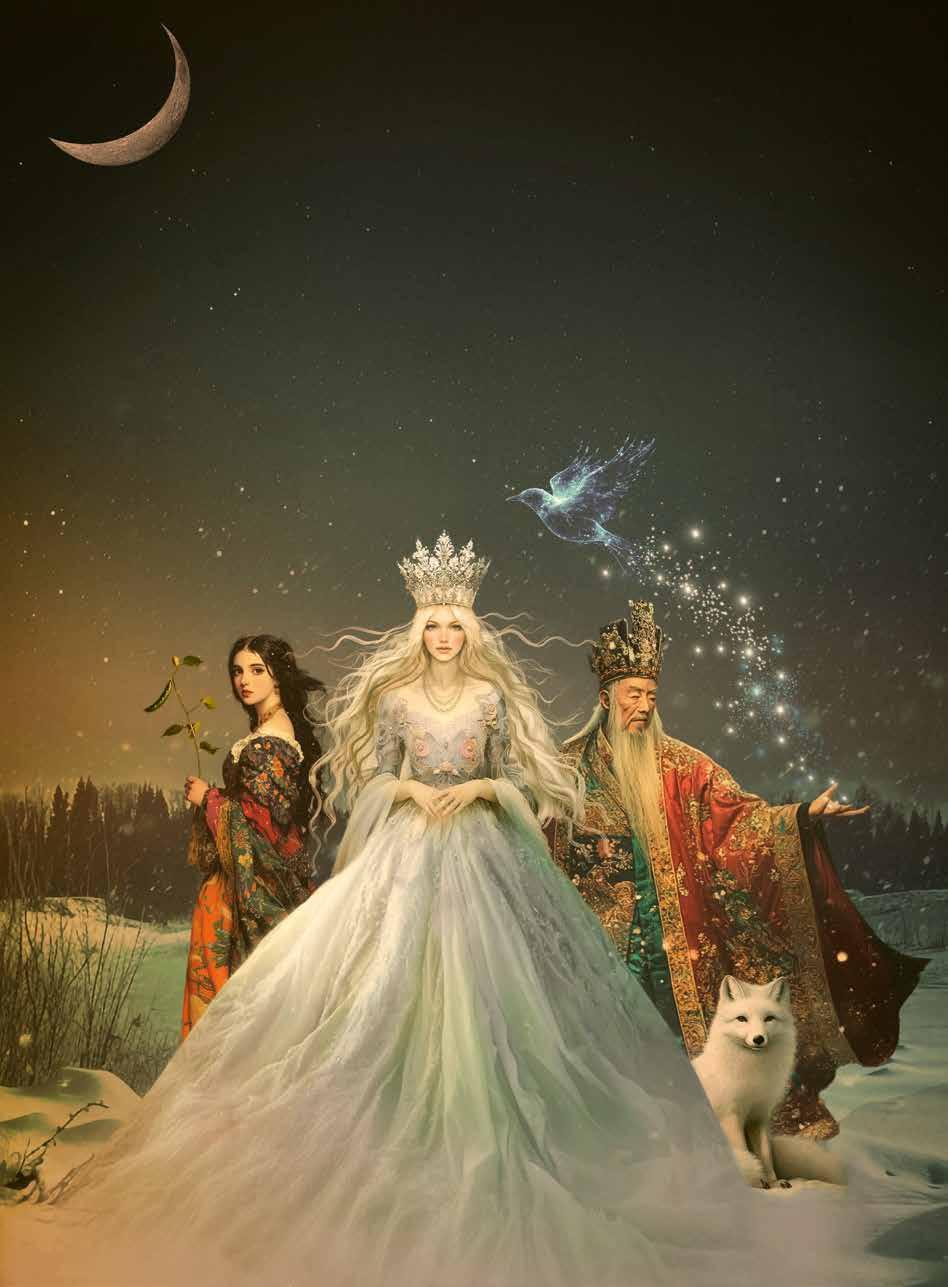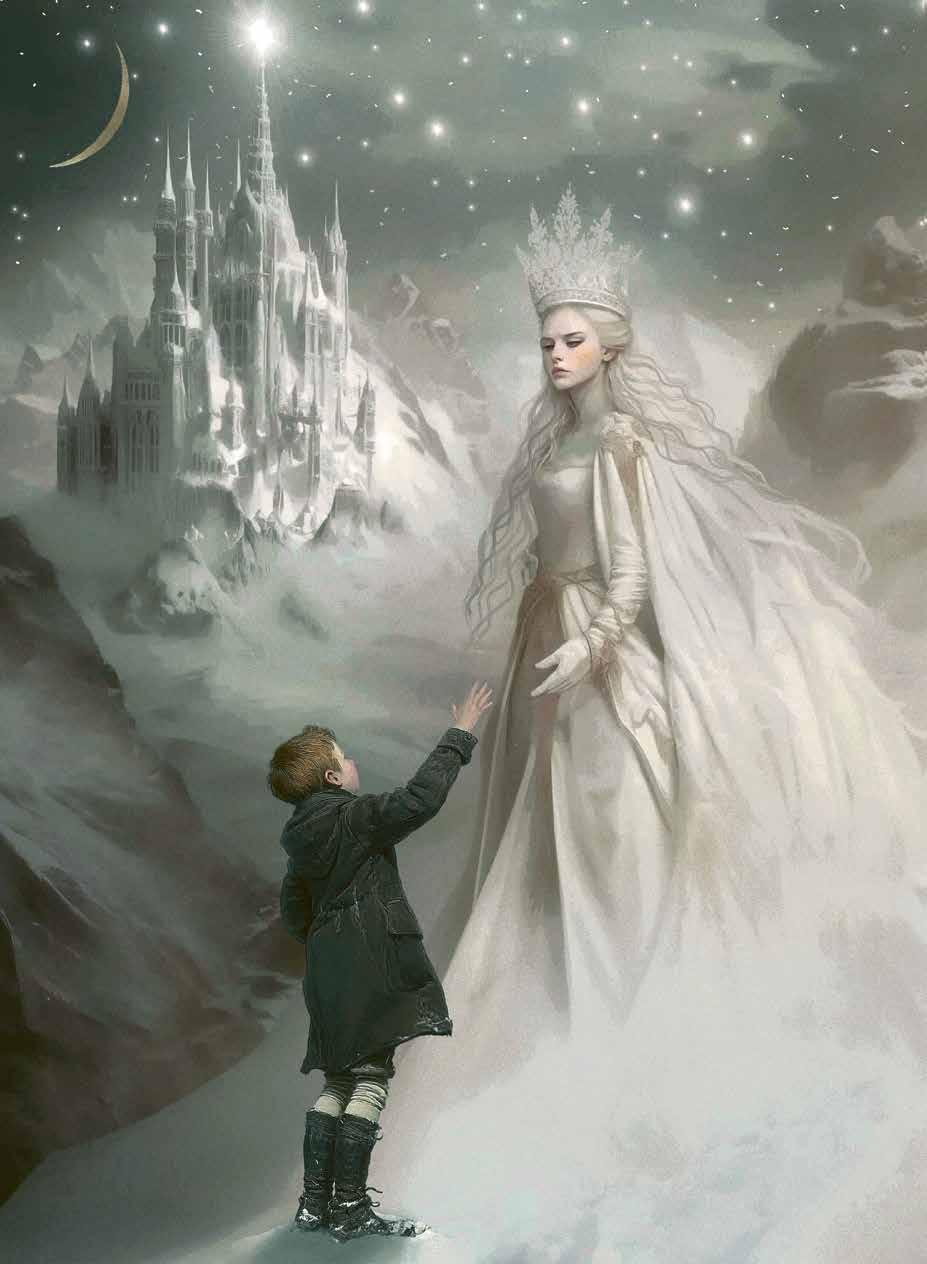 horde de renards blancs suivait l’équipage. Les bêtes glapissaient en chœur, donnant toujours plus de courage au jeune Kay. Il ne voulait pas lâcher prise, enhardi par la joyeuse compagnie des renards et trop heureux de prouver à quel point il était valeureux. Mais bientôt, un froid terrible commença à l’envelopper. Il avait si froid qu’il crut mourir. C’est à ce moment que le carrosse s’arrêta. Une femme, d’une splendeur si fantastique qu’elle vous glaçait le sang, en sortit. Elle semblait revêtue d’un manteau de neige. Elle invita Kay à venir se réchauffer sous les nombreuses peaux d’ours, de rennes et de loups qui couvraient la banquette du carrosse. Kay, hypnotisé par sa beauté, monta dans le carrosse, mais il restait transi de froid. Alors, la femme dont les yeux étaient pareils à des lacs gelés lui donna un baiser. Et ce baiser fut pire que la morsure du froid. Car s’il lui sembla qu’il se réchauffait, il oublia dans le même temps tout de sa vie d’avant, notamment sa chère Gerda qu’il avait tant négligée ces derniers temps. La femme, qui était la reine des neiges, lui déclara alors :