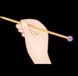 On tient une aiguille dans chaque main, entre le pouce et l’index : l’aiguille gauche assez près de la pointe, l’aiguille droite un peu plus loin. Les autres doigts repliés aident à soutenir les aiguilles.