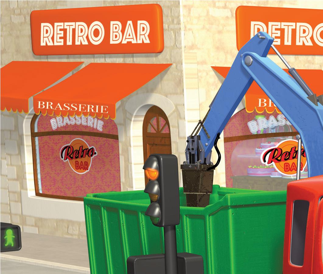 Avec son camion-grue, Manu fait la tournée des bornes de recyclage de P’tite ville pour récupérer les bouteilles et les bocaux de verre usagés que les gens ont triés.