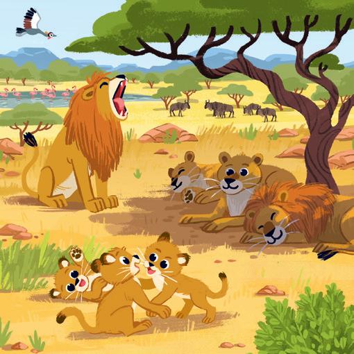 Quand il fait chaud, les lions adorent faire la sieste à l’ombre. Les lionceaux, eux, préfèrent jouer à la bagarre. Ils apprennent ainsi à se battre pour devenir aussi forts que leurs parents.