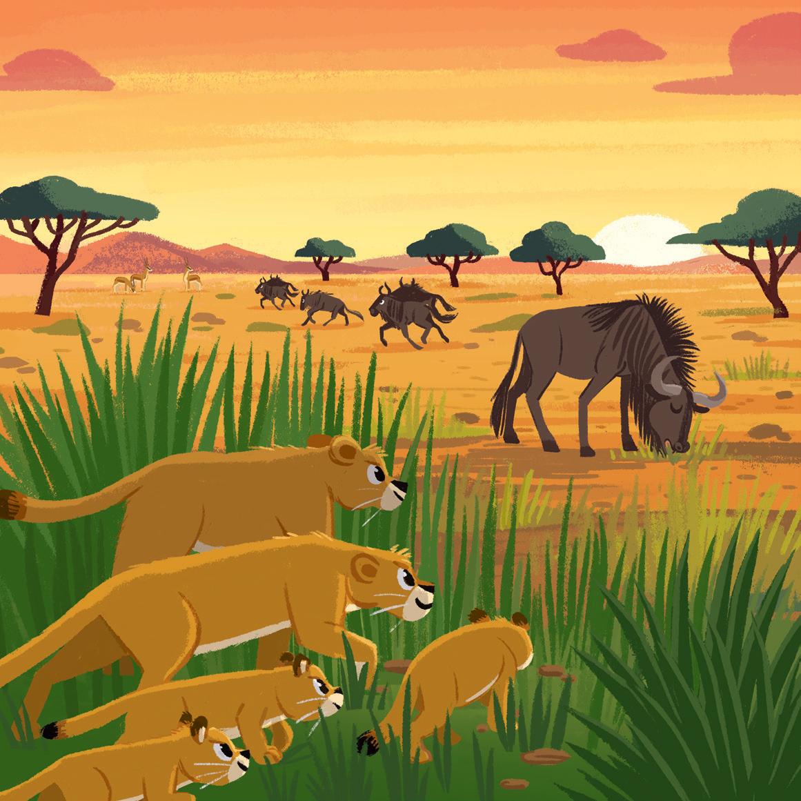 Lorsqu’il fait moins chaud, les lionnes partent chasser. Elles se cachent dans les hautes herbes et attendent qu’un animal s’éloigne de son troupeau : souvent un gnou ou une antilope. Puis, elles lui sautent dessus. Les lionceaux observent leurs mères pour apprendre. Une fois le repas attrapé, c’est le mâle qui mange en premier. Il a besoin de force pour défendre les siens.