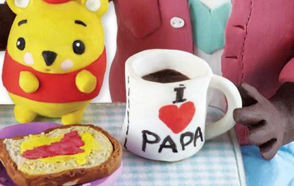 Papa fait goûter le yaourt à Bébé avec une cuillère.