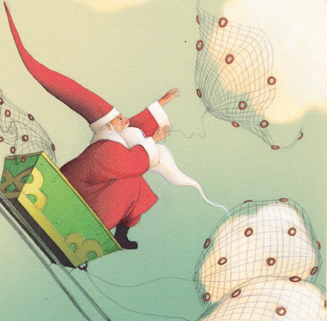 Puis il prend des cordes, des ficelles et des filets de pêche. Une fois qu’il a tout entassé dans le traîneau, il lui reste tout juste la place pour s’asseoir. « Prêts pour le décollage ? Direction les nuages ! » lance le Père Noël.