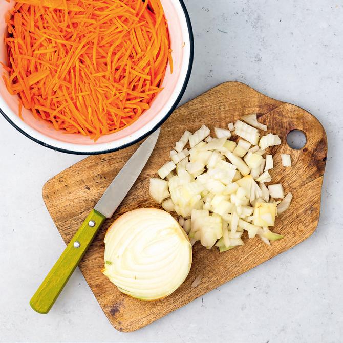 2. Sur la planche à découper, épluche et émince les oignons. Épluche et râpe tes carottes finement avec le mixeur.