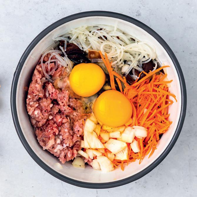 dans le saladier, ajoute les oignons et la viande. Ajoute sel, poivre et sauce nuoc-mâm. Casse les 2 œufs et mélange le tout.