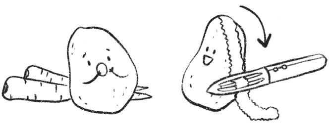 Éplucher des carottes, des pommes de terre, des navets, des betteraves, etc. : L’économe permet de faire des épluchures fines et de ne pas trop entamer la chair. Place le légume au creux de ta main et épluche-le du haut vers le bas.