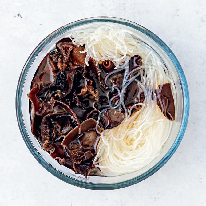 1. Remplis le bol d’eau chaude et fais-y tremper les champignons et les vermicelles.