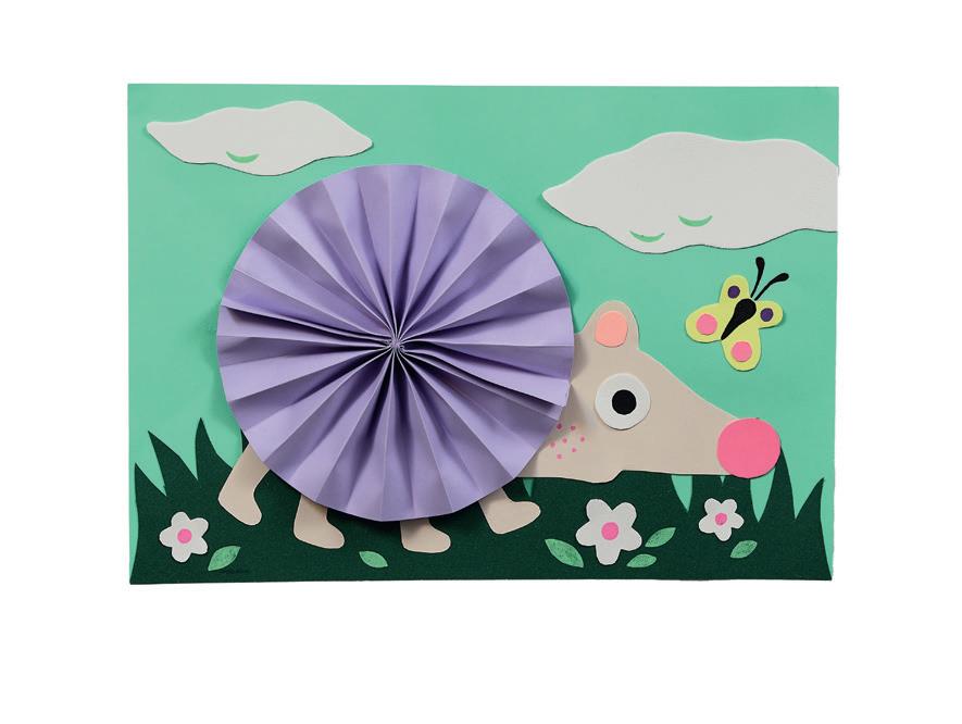 Colle le rond sur une feuille A4. Ajoute une tête et des pattes pour créer ton hérisson en utilisant du papier couleur. Fais un décor tout autour !