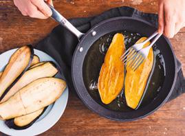 Si l’origine de ce plat se perd en controverses entre Parme, Naples ou la Sicile, on n’y pense plus une fois qu’on goûte à une parmigiana bien préparée. Cette recette est inspirée de celle que préparait la mère de l’écrivain Erri de Luca, en « trois feux », celui du soleil, de la friture et du four !