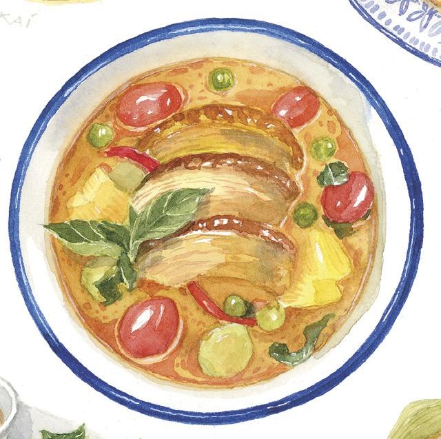 Le curry rouge, kaeng pet - แกงเผ็ด, est très populaire : il en existe de nombreuses variantes avec des viandes ou des légumes. Cette pâte de curry entre par ailleurs dans la composition de plusieurs plats comme les croquettes de poissons frites, thod man pla - ทอดมันปลา, et les papillotes de flan de poisson, hor mok - ห่อหมก.