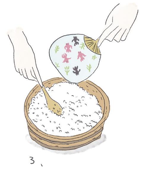 3 Tout en mélangeant, faites refroidir le riz avec un éventail : il aura ainsi obtenu un bel aspect brillant.