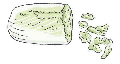 Coupez le chou en morceaux de 4 cm. Retirez l’extrémité de la ciboule asiatique et coupez-le de façon à avoir des tiges de 8 cm environ. Pelez, dégermez et coupez l’ail en fines lamelles. Retirez les pépins du piment et taillez-le en lamelles.