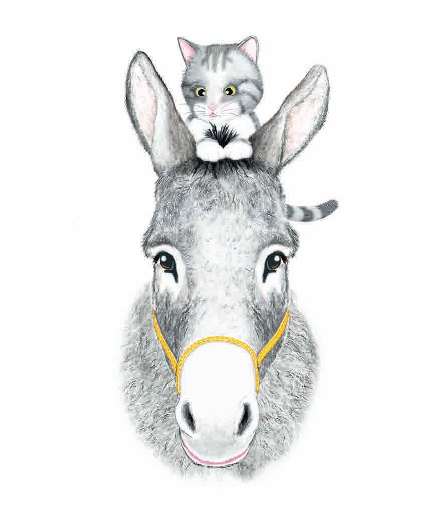 – Mes chéris, je vous présente mes compagnons : mon chat Gataki et mon âne Ulysse. Après ce long voyage rentrons vite à la maison.