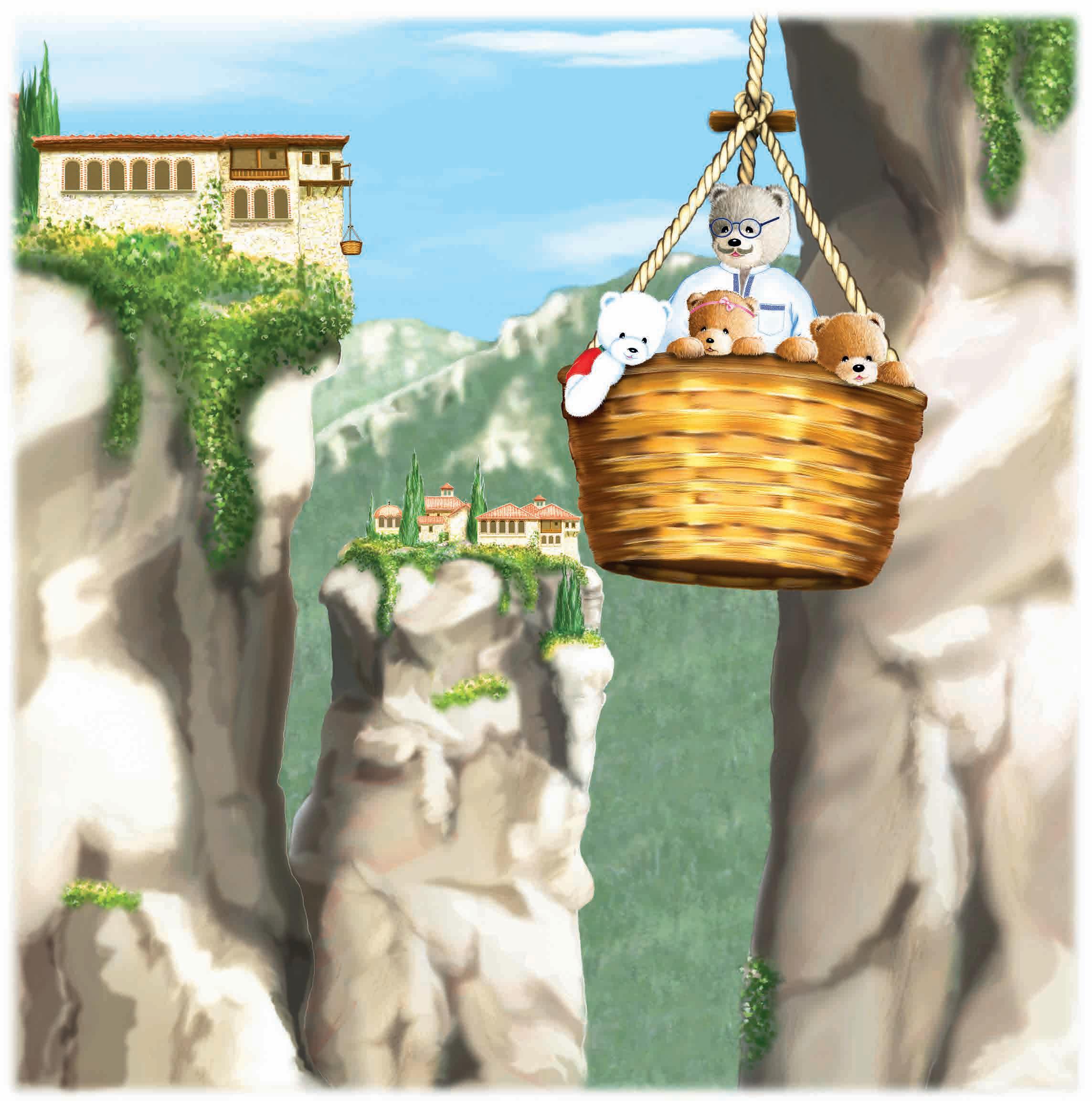 – Observez ces monastères accrochés au sommet de ces énormes rochers. Eh bien autrefois, pour aller au village, leurs habitants descendaient puis remontaient dans un grand panier suspendu au bout d’une corde. Nous allons faire comme eux ! À peine installée dans la nacelle, Bloume affolée se met à crier.