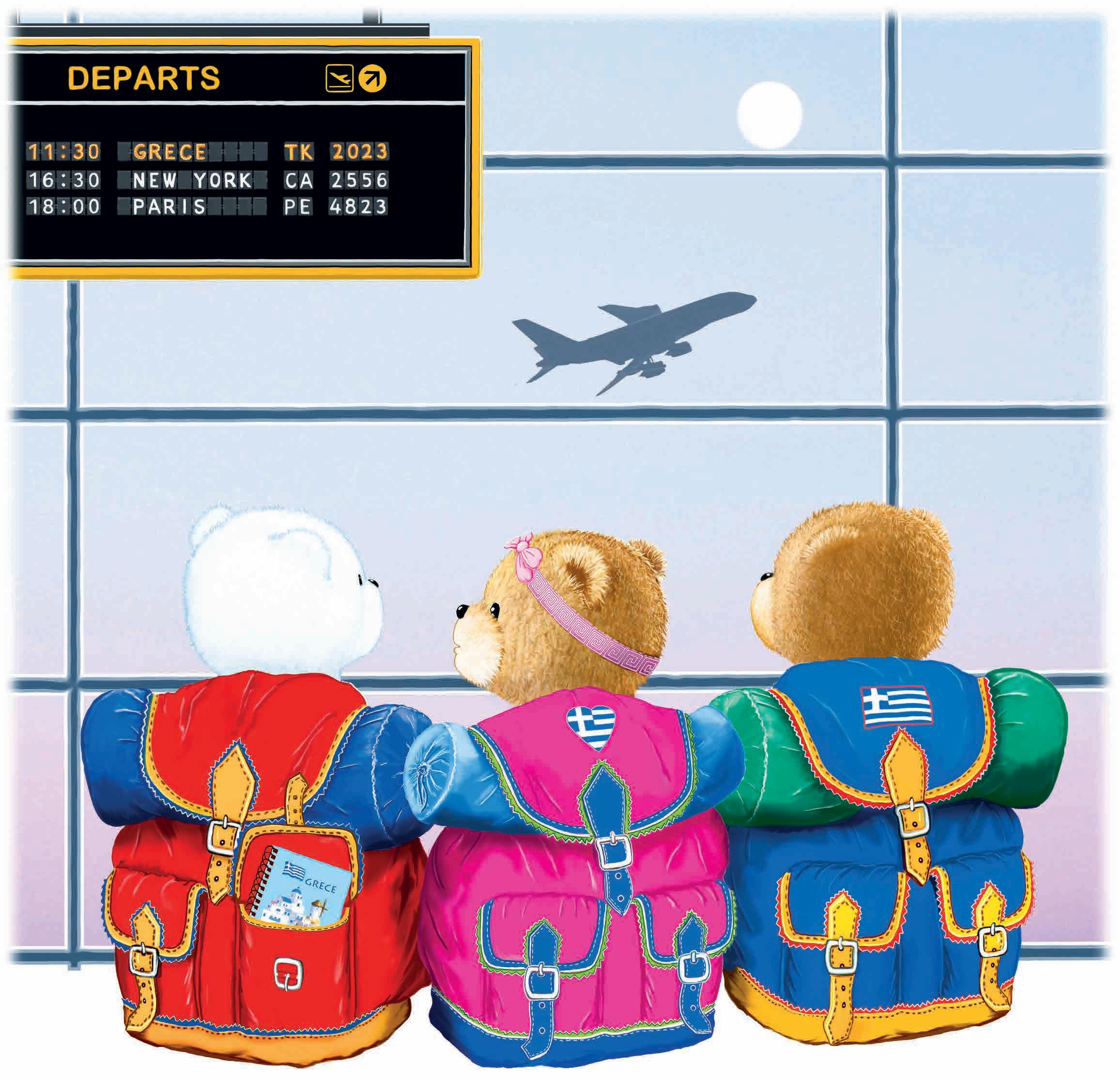 Toudouk, Bloume et Orso attendent en salle d’embarquement. Ils ont hâte de prendre leur avion pour la Grèce.