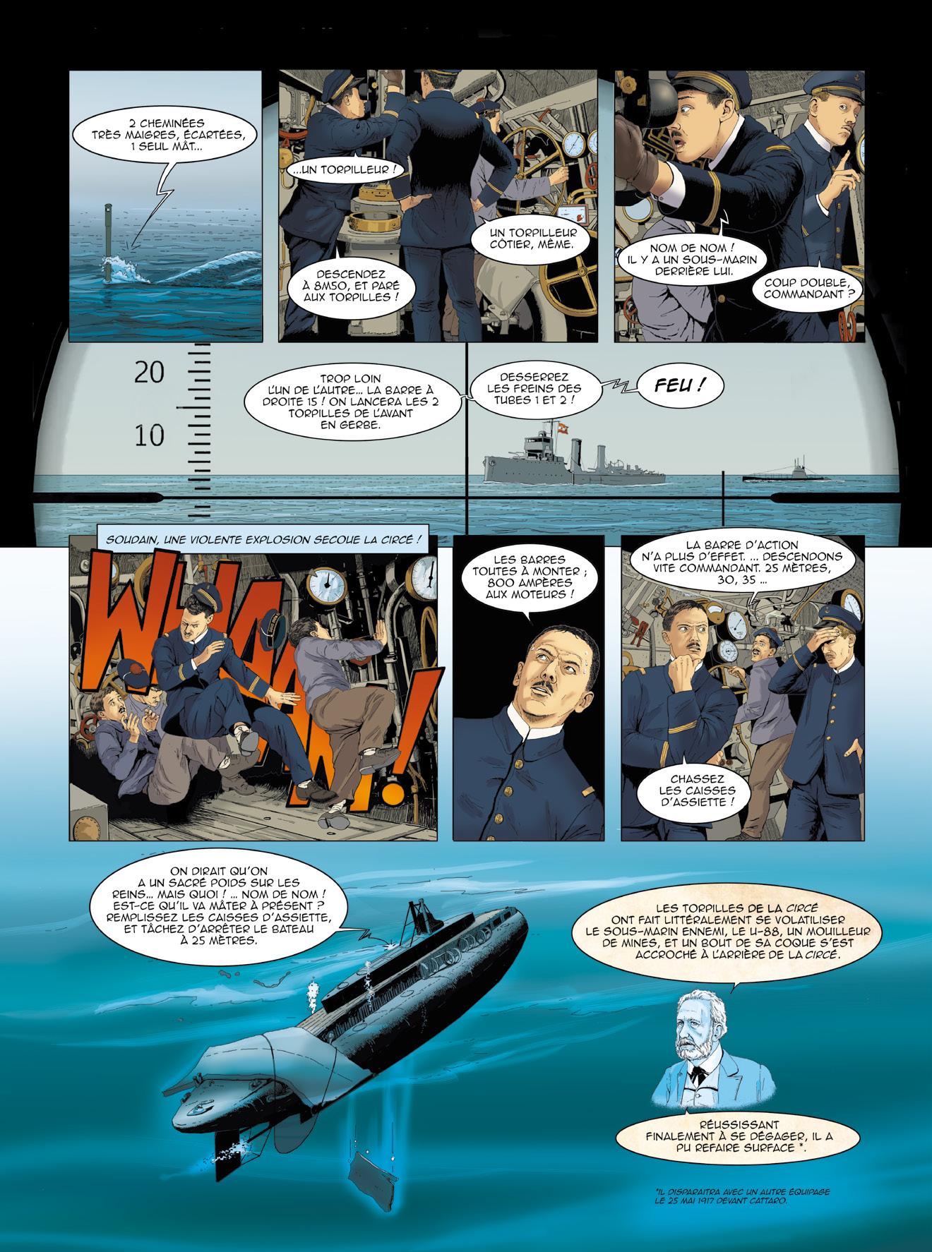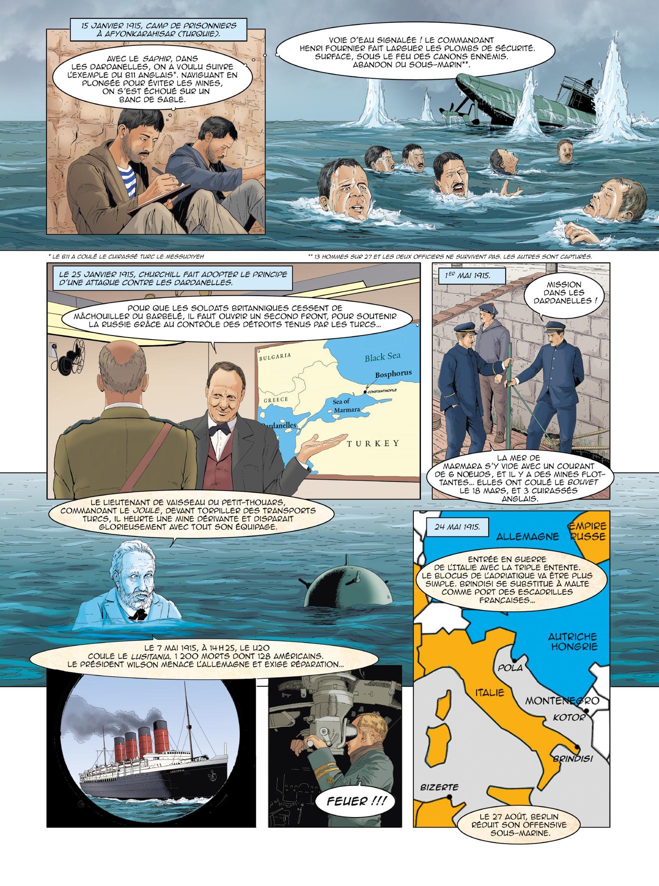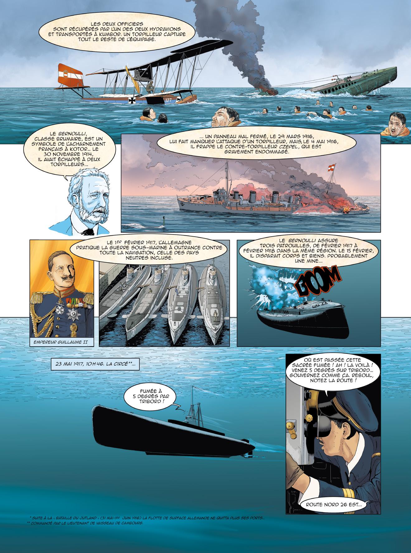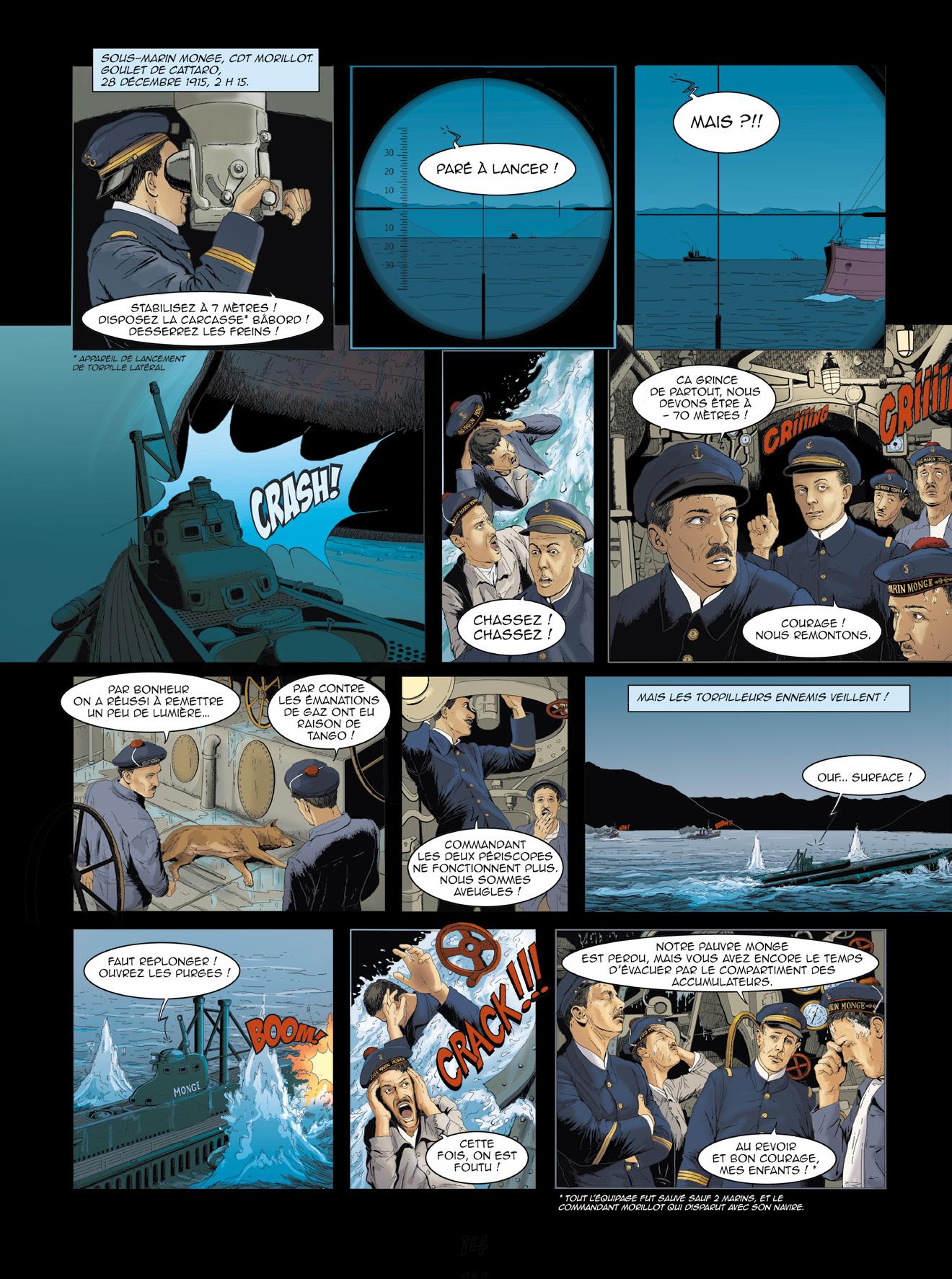 L’éditeur souhaite remercier les contributeurs bénévoles qui ont précieusement aidé à la réalisation de cette bande dessinée : l’amiral (2S) Bernard Rogel, auteur du livre Un marin à l’Élysée (Tallandier, 2023), ainsi que son éditeur, pour leur aimable autorisation d’adapter des passages de cet ouvrage ; le vice-amiral d’escadre Jacques Fayard, commandant la FOST et les forces sous-marines au lancement de ce projet ; le vice-amiral d’escadre (2S) Eric Scherer pour la vérification des uniformes représentés ; le contre-amiral (2S) Dominique Salles, président de l’AGASM ; le capitaine de vaisseau Vincent Vacqué, initiateur de ce projet éditorial, pour son efficace et aimable collaboration ; M. Bernard Micaelli, architecte pour la France du NSRS et expert en sauvetage sous-marin, pour ses conseils ; M. Hervé Glandais, Directeur du programme Barracuda chez Naval Group, pour son aimable hospitalité ; M. Victor Bouissou-Thomas, Directeur de la communication Sous-Marins chez Naval Group, pour son soutien continu.